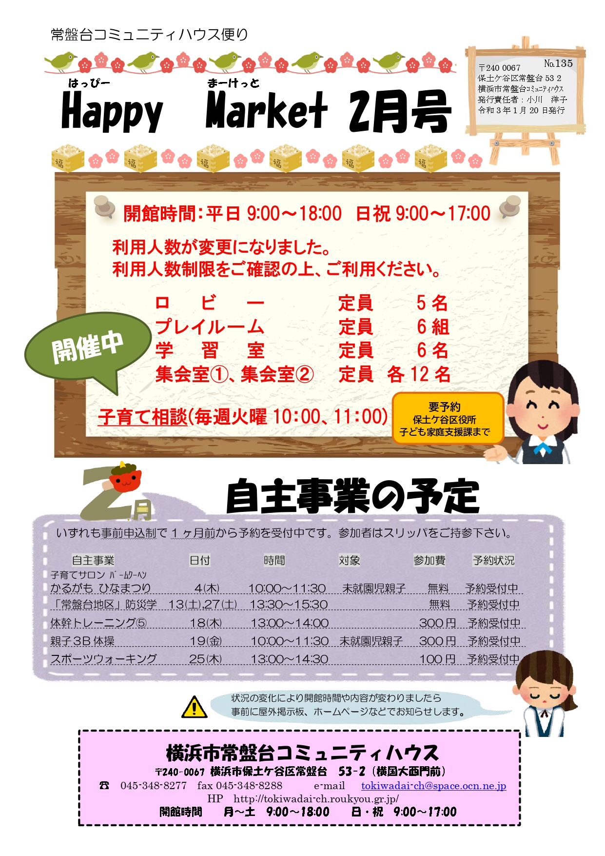 横浜市常盤台コミュニティハウスは地域の皆様の施設です。サークル活動や話し合いの場として、自主事業への参加など地域のコミュ ニケーションをより深めたり憩いの場としても小さなお子さんから年配の方までお気軽にご利用いただけます。自主事業のお知らせもホームページにてお知らせしております。皆様のご来館を職員・スタッフ一同、心よりお待ちしております。