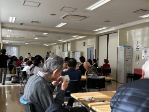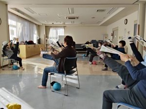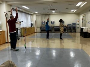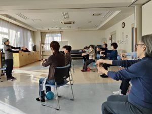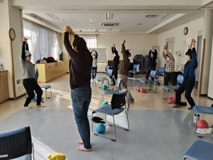 12月15日(月) 「チェアリズム体操」が今月も手先、足先のほぐしから肩甲骨周りなどのほぐしをしていきました。年齢がいってからはヒップ周りの筋力を鍛えたりスクワットが必須と取り入れていきました。